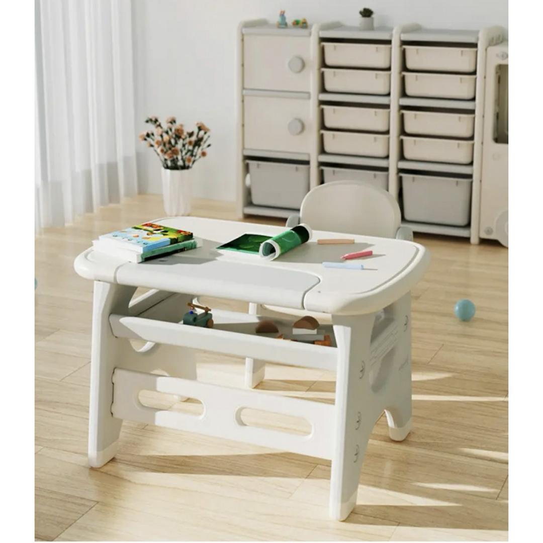 The table has a roomy storage space for books and extra toys that aren’t in use and smooth surface for art & craft, dinning, learning and all activities you can think of. This set of table and chair requires some assembly. Everything you need to assemble is inside the box.