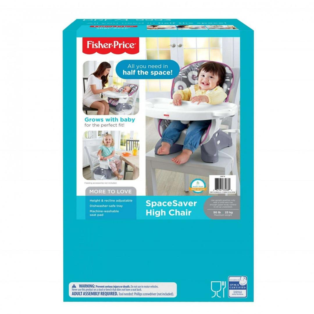 With the Fisher-Price SpaceSaver High Chair, you get the easy-to-clean, customizable seating you love from a full-size high chair but in a super convenient, compact design that fits easily on most dining and restaurant chairs! Two height adjustments. Three recline positions. Removable, dishwasher-safe, easy to clean (and BPA free!) feeding tray. Machine-washable seat pad and five-point restraint-it's got it all! And you can transform it into a toddler booster when your little one is ready. Plus, the Fastfinder link makes it easy to hang bibs, toys and other items you may need! When you're short on space, we've got you covered. Where development comes into play Self-Expression: High chairs help babies build confidence as they learn to feed themselves and participate in meal time.