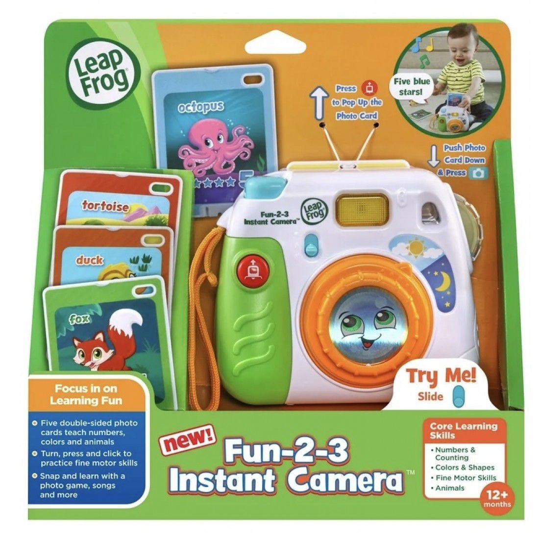 Capture smiles and learning with the Leapfrog Fun-2-3 Instant Camera! This pretend camera inspires imaginary play with picture-taking activities and pop-up animal pictures. Five double-sided multi-color photo cards feature two sides of play and learning. The first side includes early learning about animals, shapes, colors and numbers one through five. Flip to the second side for fun facts about animals and habitats. Help children practice what they're learning by searching cards for shapes and counting objects. Strengthen motor skills by grasping and pushing down the cards, turning the zoom lens and clicking the shutter button. Turn the viewfinder color wheel to see the world in yellow, blue or green! Learn about opposites by spinning the lens from day to night. When kids are done playing, easily slip the photo cards onto the included wrist strap for quick cleanup and storage. Imaginative play makes learning a snap! Intended for ages 12+ months. Requires 2 AAA batteries. Batteries included for demo purposes only. New batteries recommended for regular use. Unisex.