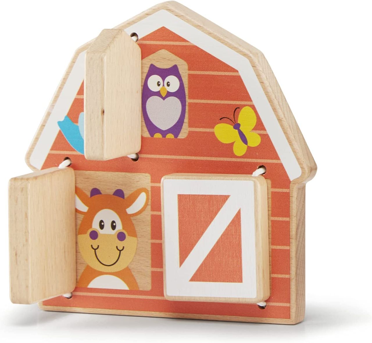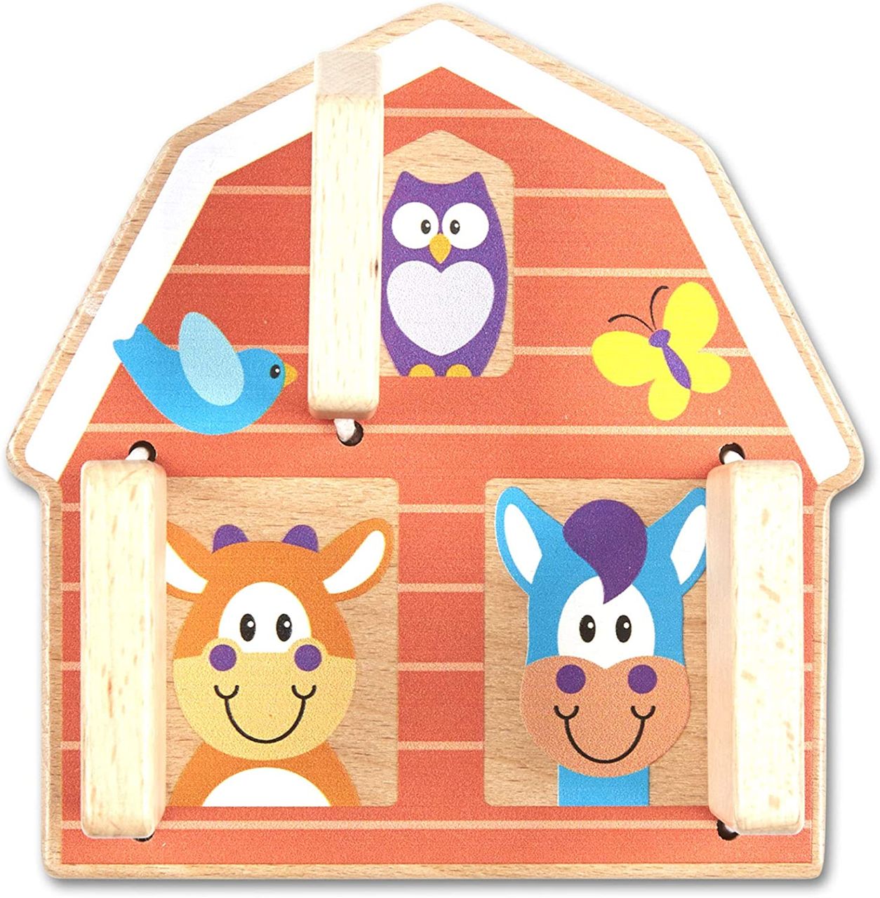 Babies will love playing peek-a-boo with farm animals on this adorable wooden barn-shaped grasping toy. Lift the soft-hinged barn doors to reveal three farm animals’ smiling faces (cow, horse, and owl); makes a satisfying “clack” when the doors are closed again. Great for promoting early developmental skills, such as color recognition, animal recognition, and fine motor skills. Bright colors, bold patterns, and whimsical designs boost skills while sparking imagination and wonder.