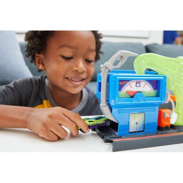 Fuel kids’ imagination with this assortment of kid-favorite sets featuring recognizable city locations. Your kids can drive their Hot Wheels car to lock up bad guys in the police station, spin down the fire pole at the fire station, or fuel up and go at the gas station Getting hungry Order a pizza at the Pizza Shop Kids drive right in and lift the lever to place their order. The car spins down into the shop and the oven pops open so kids can escape. There are some mischievous dinos playing in the Pizza Shop, so kids will want to get their lunch and speed out of there fast Kids can drive into the Downtown Speed Shop and lift a lever to tune up their car at various stations in the set. When they get to the top of the building beware There is a brontosaurus on the loose so they will have to make a quick getaway down his neck and out of his mouth to safety Each exciting set provides ample storytelling play based on imaginative action with Hot Wheels vehicles. Everything connects Each set connects to other Hot Wheels City sets and is compatible with orange track, too. Includes one Hot Wheels vehicle.