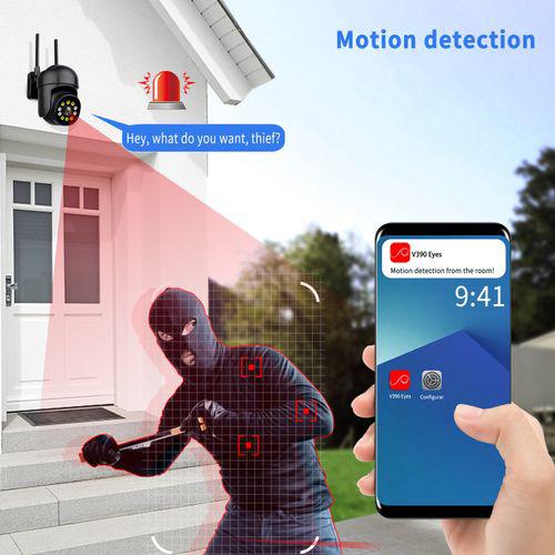 When motion is detected, the camera emits white light and sound alarms to scare the thief or burglar and send notification to your smart phone.