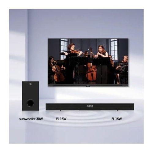 This SOUNDBAR system features Bluetooth 4.0 connectivity that allows you to play songs from your smartphone and tablet. You can play your favorite song from SD card using the provided USB card reader. The sleek design complements the house interior. 5.08 cm (2) full range driver and 20.32 cm (8) subwoofer driver; Sleek soundbar fits discreetly under your flat panel TV; Two slim satellites can work separately or combine together to a soundbar; Innovative automatic multi-color LED on subwoofer; Crystal clear sound and heart thumping bass; Bluetooth 4.0 version; Bluetooth operation range works at up to 15 meters; Plug and play USB/SD card reader; USB reader supporting MP3/WMA dual formats decoding; Uninterrupted digital FM works on PLL technology; FM storage for up to 100 stations; Bright white LED display with a clear view angle; Wireless Play your desired song and FM station directly with numeric keys on the remote.