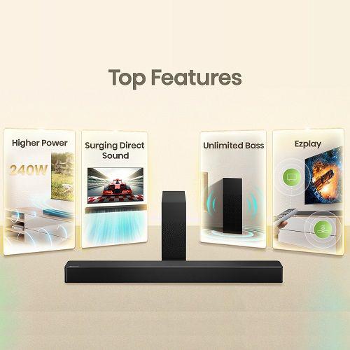 The HS2100 Soundbar comes with 2 speakers and a wireless subwoofer that boasts a whopping 240 watts of power and superior audio performance powered by Dolby Audio Technology.