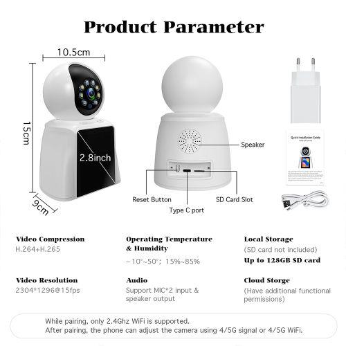◆ 2MP 2.8-inch bidirectional video and voice call network camera with screen◆ Bidirectional video and voice calls, one click call◆ Automatic white balance and automatic backlight compensation◆ Supports infrared night vision◆ Built in omnidirectional antenna◆ Support mobile detection alarm recording◆ Supports TF card recording, up to 128GB card, and supports cloud storage◆ Support remote monitoring on mobile phones (Android and Apple)◆ Support mobile app message push◆ WIFI (2.4G) three-step connection, convenient and practical ◆ Used in households, offices, shops, warehouses, and other occasions