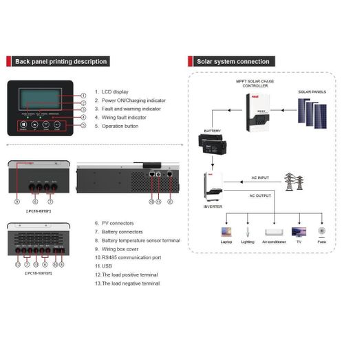 • Protection: PV array short circuit, PV reverse polarity, Battery reverse polarity, Over charging, Output short circuit