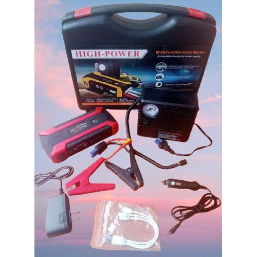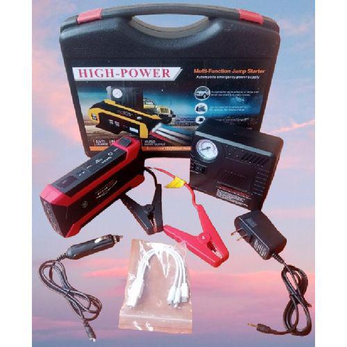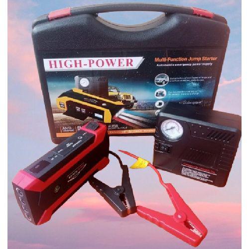 Multifunction Jump Starter Power Kit With Tyre Inflator Air Pump Fill. Capacity: 99800mAh 12-Volt( Red device)1*Car Jump Starter Power Bank,1*4-Tip USB Charging Cable,1* Tyre Inflator Air pump fill1*Jump Cable,1*Car Charger,1*Household Power Adapter,1*User Manual.