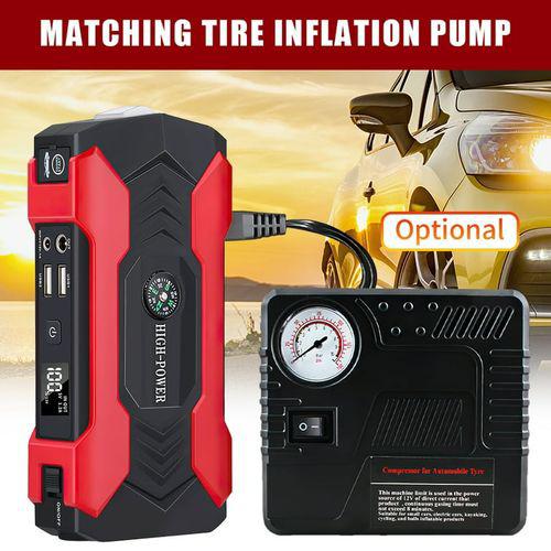 Multifunction Jump Starter Power Kit With Tyre Inflator Air Pump Fill. Capacity: 99800mAh 12-Volt( Red device)1*Car Jump Starter Power Bank,1*4-Tip USB Charging Cable,1* Tyre Inflator Air pump fill1*Jump Cable,1*Car Charger,1*Household Power Adapter,1*User Manual.