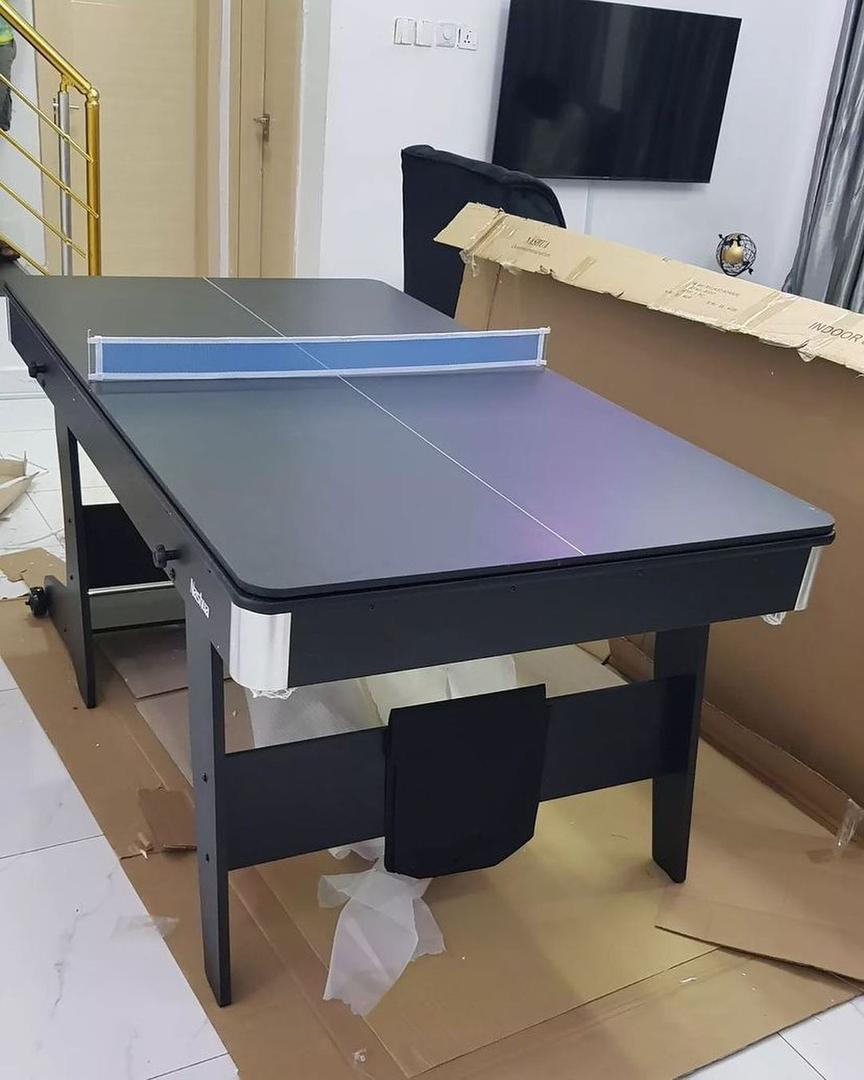 SPECIFICATIONS: Table colour: Black body, green felt, dark brown tennis top . Size: 6ft x 3ft . Accessories: 2pcs cue sticks, 1 set of pool ball, 1pc triangle, 2pcs chalk, 1 brush, 2pcs bat, 3pcs tennis balls, 1pc net