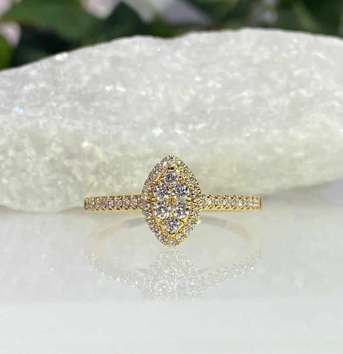 - It posses clusters of diamond stones at the center which gives it a Marquise shape, surrounded by a single halo with petite diamond stones encrusted on it