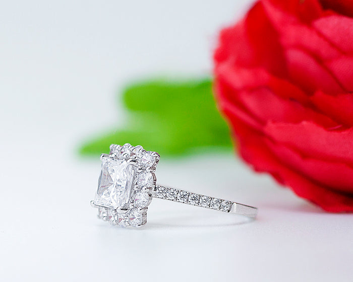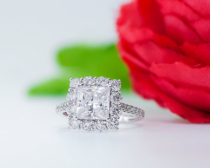 - It has a princess cut Cubic Zirconia (CZ) stone at its center which is accented with a single halo embedded with petite round cut CZ stones.