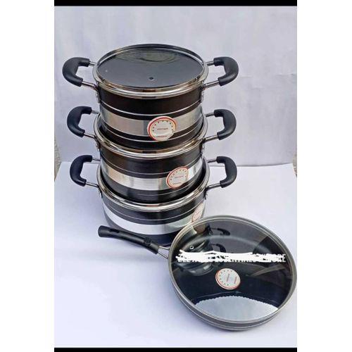 This Non-Stick Cookware is made from high grade aluminium materials which ensure superior durability. A must use for all modern homes. You can use these non- stick pots for a long period of time provided you use plastic or wooden kitchen tool sets instead of using metal ones. They offer best results at all times. They have tempered glass covers which allows for proper viewing while cooking and they offer a tight fit so all the nutrients and flavor will be properly trapped in. These non-stick pots come in different size to accommodate all your cooking needs. They are really nice cookware set for everyday use. The bottom of the pots have been properly designed to sit perfectly on any electric or stove top. Cook different delicacies with this 3 Set Non-Stick Pots 1fry pan. Light and easy to maintain. These Non-Stick Pots have a protective layer added to make it less reactive and more scratch resistant. Suitable for all cooking sources: electric and gas sources or glass and ceramic or halogen burners. These non stick pots allow you to prepare virtually any kind of food. Its nice interior coating helps keep food from sticking to the pot and also allows for easy cleaning afterwards. It is dishwasher safe. The handles and lid knobs are well-designed to provide a comfortable and secure grip. they also remain cool even after heat has been applied to the cookware. The non-stick pots heat up quickly and food is guaranteed to be cooked evenly. You will use less oil when cooking with the non-stick pots which make them ideal for health conscious people.
