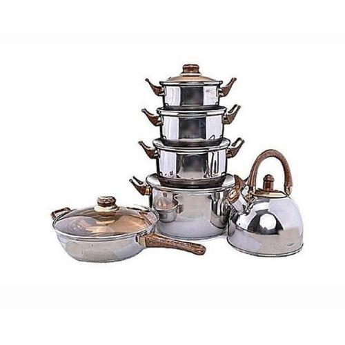 This Stainless Steel 6-Piece Cookware Set features a , 8'' casserole 9'' casserole pot with lid pot with lid, 7'' casserole pot with lid, 6'' casserole pot with lid, 6'' . This cookware set is suitable for all cooking surfaces. As it is made using stainless steel, this cookware set stays strong for years to come. The Stainless Steel 6-Piece Cookware Set has a thermal diffused base for fast heating. The handles are isolated from heat and offer a comfortable grip. The highly resistant glass lids with steam vents keep the moisture locked in and help cook flavorful meals.