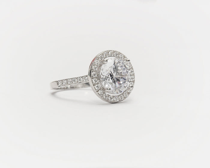 - Sandra sterling silver engagement ring features a huge round cut high quality cubic zirconia center stone and a single halo.