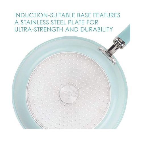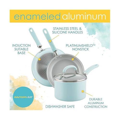 Featuring vibrant, shimmering color combined with value-driven functionality, this collection of essential pots and pans upgrades Rachael's always-reliable performance with durable aluminum construction for ultra-even heating and browning. Even better, the cookware interiors feature enhanced Platinum Shield Technology silver nonstick reinforced to be 9 times harder than titanium for effortless food release of the stickiest recipes like Rach's Spinach-Artichoke Cheesy Tortellini or her Sticky Orange Chicken with Herbs. Plus, all of the pots and pans - from the covered saucepans and 5-quart Dutch oven to the skillets and kitchen tools - are dishwasher safe for quick and easy cleanup.