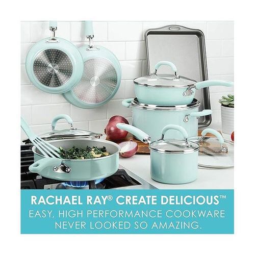 adiant and solution-oriented, the Rachael Ray Create Delicious 13-Piece Aluminum Nonstick Cookware Set brings high performance and easy convenience to home chefs eager for kitchen versatility with style.