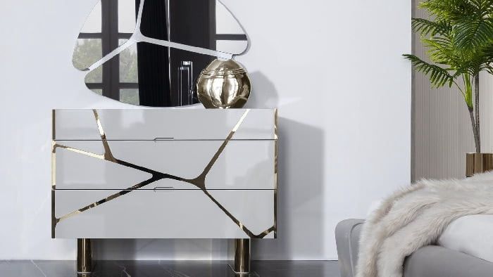 The crisp lines, elegant curves, and smooth surfaces lend an air of sophistication that will add character to any room. For added drama, you can customize the finish with accents such as drawer pulls or knobs.