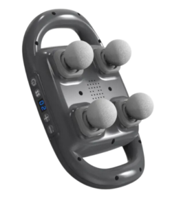 A four-headed vibrating massager is a handheld device designed for deep tissue relief and muscle relaxation.