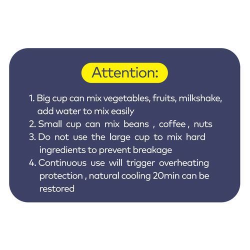 Attention:1. Big cup can mix vegetables, fruits, milkshake, add water to mix easily2. Small cup can mix beans, coffee, nuts3. Do not use the large cup to mix hard ingredients to prevent breakage 4. Continuous use will trigger overheating protection, natural cooling 20min can be restored