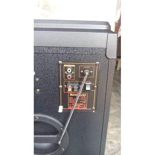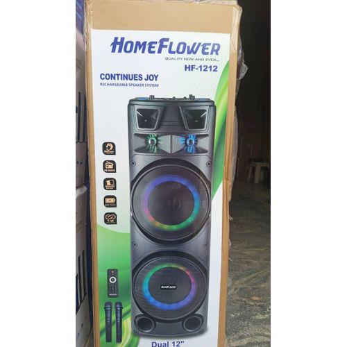 Experience powerful audio with the HomeFlower HF-1212 "Continues Joy" Rechargeable Speaker System. This dual 12" speaker setup delivers vibrant sound with eye catching LED lighting effects. Featuring USB input, FM radio, MicroSD support, and a built-in rechargeable battery, it's perfect for parties or home entertainment. The wireless microphones included make it ideal for karaoke nights. Enjoy quality sound and convenient portability in one stylish package.