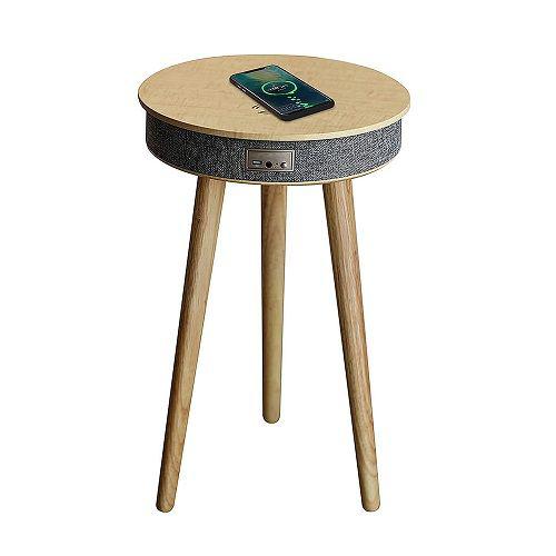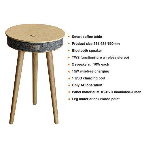 Premium cloth and real timber legs on the outside elegantly cover the latest technology and premium components on the inside. The 4 speakers along with tweeter and subwoofer deliver crystal clear 360 degree sound. Listen to music, make phone calls, charge upto 3 devices at the same time including a wireless phone charger built into the tabletop so all you need to do is set your phone down and watch it charge.