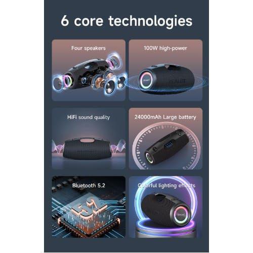 Extraordinary sound quality100W high power output, high volume and powerful soundProfessional tuning, with three special sound effectsWith a shoulder strap for easy carryingSupport TWS, 2 speakers can interconnectType-A and Type-C dual USB power supply interface, convenient to charge your mobile phoneWith 24000mah built-in battery, provide long using time