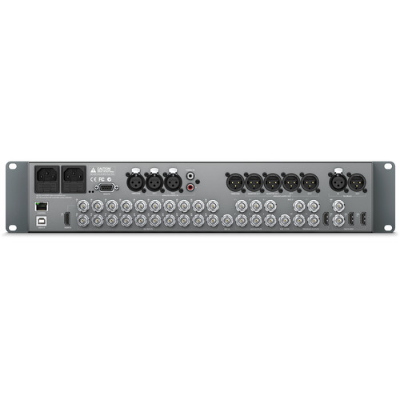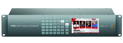 he ATEM 2 M/E Production Studio 4K from Blackmagic Design is a live event multi camera production switcher with 20 video inputs built into a 2RU chassis. Supporting NTSC/PAL/HD and Ultra HD 4K (3840x2160) video formats, the switcher connects to a wide range of cameras and sources, delivering a single program stream in SD, HD, or Ultra HD video. All this is done live and in real time with no rendering required. The switcher features a reference video input for synchronizing the switcher to other equipment using tri-level or blackburst sync. Each input also features its own frame synchronizer, which allows you to use cameras that do not feature Genlock as well as input video from computer sources. The switcher provides 20 6G-SDI video inputs and one 4K HDMI input, which shares a channel with one of the 6G-SDI inputs. Outputs include three 6G-SDI Program outputs, one HDMI Program output, six 6G-SDI auxiliary outputs. All inputs and outputs are SD/HD/UHD switchable, with the exception of dedicated down-converted HD Program output for monitoring UHD footage on an SDI-equipped HD monitor. Two independent multi-view outputs are available, in both SDI and HDMI, so you can monitor up to 16 cameras across two screens. The switcher features luma and chroma keyers for real time effects and composites in Ultra HD, with 10-bit processing. Two downstream keyers allow you to use two graphics/logos/titles/lower thirds from up to twenty stored graphics in a wide variety of formats. Additionally, the switcher features a built-in SuperSource layer switcher which, in addition to the two full M/E's, keyers and DVE, provides an additional four independent DVE channels letting you re-size and position live cameras, video replays, broadcast graphics, and more. A built-in 22-input audio mixer handles the embedded HDMI and SDI audio from the 20 active video inputs as well as audio from the balanced or unbalanced analog audio inputs to provide you flexibility and creative audio options. Audio output is embedded in the SDI and HDMI stream, as well as available via balanced audio outputs. The control panels connect via the Ethernet port and provide control all the features of the switcher. Illuminated front panel buttons on the switcher allow you to locally select the aux output, while a 2-inch LCD screen built into the front of the unit allows you to see the aux output for instant confirmation of the correct output. Either a Mac or PC running the included ATEM software controls the switcher's operation and settings. For those who like the feel of a physical control panel, the optional ATEM 1 M/E and 2 M/E Broadcast Panels can be used. Video The ATEM 2 M/E Production Studio 4K switcher supports 4K Ultra HD video (3840 x 2160), which is four times the resolution of Full HD. The video format is set by the user and must be the same across each input, as the switcher cannot scale different input formats to match the project format. The switcher features 20 single link 6G-SDI and one HDMI 4K input, which allows you to connect SD/HD/Ultra HD and computer-based signals to the switcher. However, the HDMI input is shared with one of the SDI inputs, so you can only have a maximum of 20 inputs. The switcher takes reference video in for sync timing, either blackburst or tri-level sync, so that it can interface with other post production equipment. Each input incorporates its own frame synchronizer, which enables you to use cameras that do not have genlock capability or to input computer sources such as Keynote or PowerPoint Presentations. Audio The switcher includes a built-in audio mixer for mixing and balancing embedded audio from all 20 video inputs as well as the two audio inputs, each with two channel support. This lets you manually mix sources or you can set mixer inputs to "audio follow video" so your audio crossfades as you switch between sources. Video Outputs The switcher features two program outputs for the final video, delivering SD/HD/Ultra HD via three 6G-SDI port and one HDMI 4K connector. The switcher features six SDI auxiliary outputs capable of delivering the program out feed with or without the downstream keyer effects in SD, HD and Ultra HD. Control of the Aux output is by front mounted panel buttons, and built-in LCD screen for immediate confirmation of the Aux output. Two independent multi-view outputs available via an SDI or HDMI connectors so you can see up to 16 cameras across two screens. Effects Transitions The ATEM 2 M/E Production Studio 4K switcher features four built-in transitions. Cut: ATEM instantly changes from current program source to the preview source precisely at the moment you hit the button. Cuts can be performed by directly selecting sources on the program bus or more commonly by pressing the cut button to transition to the next source lined up on the preview bus. Mix: Dissolves from one image to another. You can program a pre-set transition rate, or use the included software control panel or available hardware panels to manually transition from one shot to another. Dip: Is similar to the mix/dissolve, except it first it transitions to a color/graphic or video source and then to the next shot. Wipe patterns: With 18 built-in wipe patterns, you can create over 100 different transitions, and the patterns can be inverted or softened and you can customize the color of the border. You can also insert up to three live video streams into the borders. Key Frameable Transitions The built-in DVE allows you to create key frame based DVE moves, flying graphics and animated stingers. Keyers The switcher features four upstream keyers and a DVE, allowing you to layer live video, title, graphics and animation over live video. You can choose from chroma, luma, linear, and pattern keys at Ultra HD resolution with 10-bit processing. Two downstream keyers allow you to add graphics, lower thirds, titles and logos for a polished live production. The DVE allows you to create a picture-in-picture effect. Contr