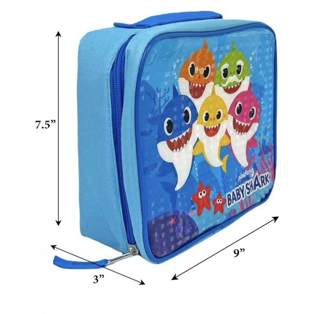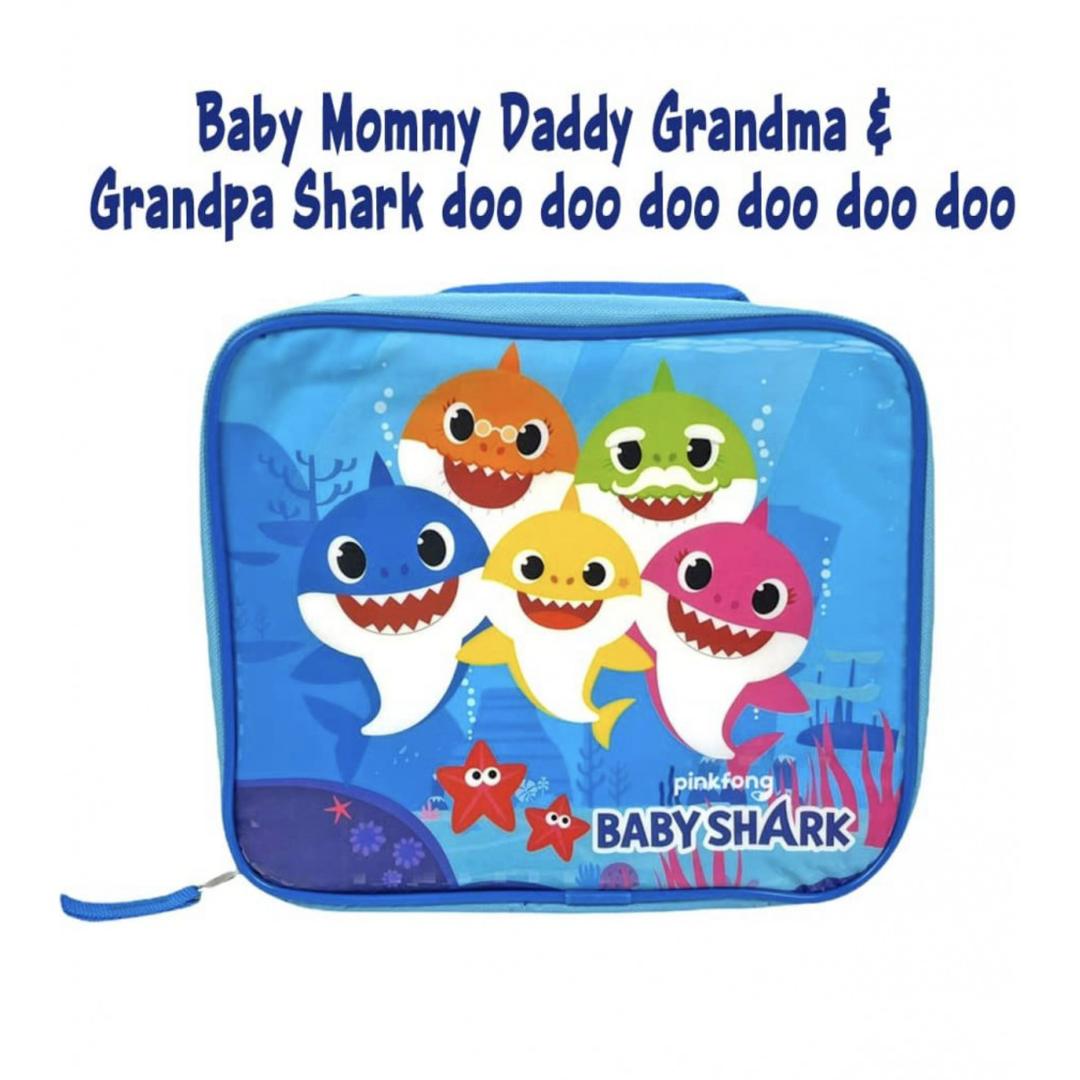 BABY SHARK LUNCH BAG – This cute blue Baby Shark lunchbox features the cartoon favorite sharks Baby, Mommy, Daddy, Grandma, and Grandpa in bright colors that stand out in the pile of lunch boxes!