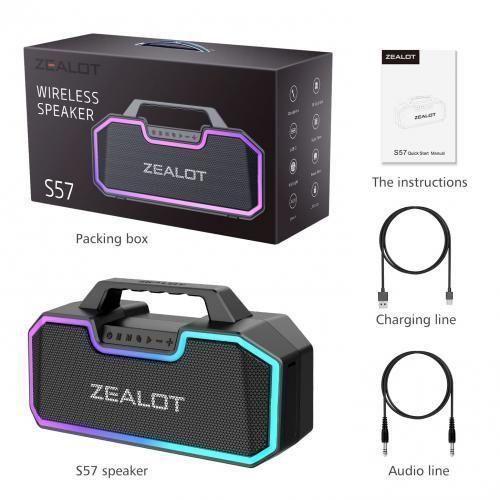 Brand:ZEALOTModel:S57Battery:14400mAh lithium batteryWorking Voltag:7.4VBluetooth:BT5.0Playtime:36 hoursMicrophone:SupportSpeaker:4 speakersOutput Power:80WPlayback Mode:Bluetooth, AUX, USB, TF Card