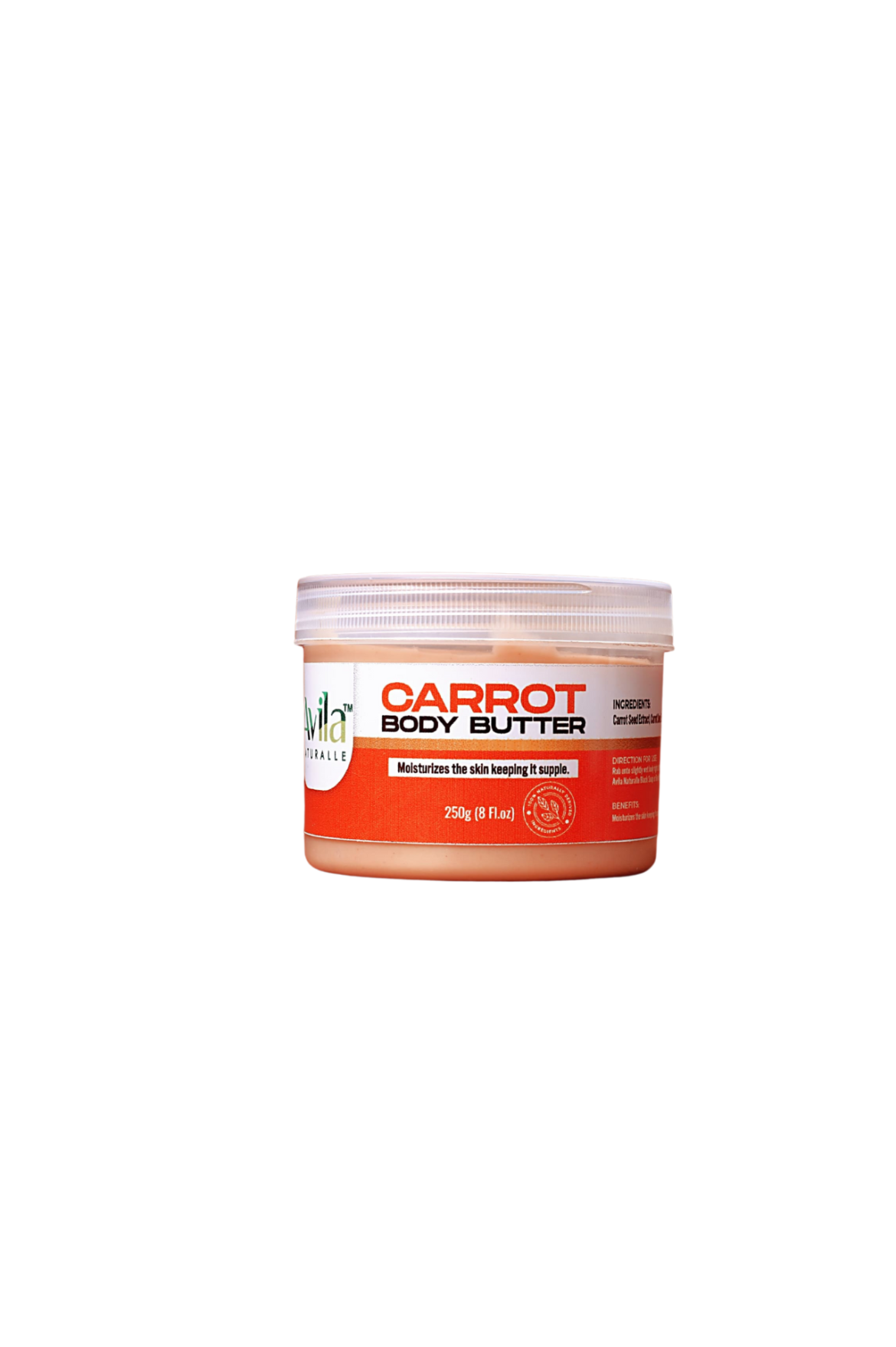Avila Carrot Body Butter, a skincare gem enriched with the goodness of nature’s vibrant carrot treasure. Dive into a world of skin-loving benefits as you discover the remarkable advantages this body butter offers. Packed with vitamins, antioxidants, and beta-carotene, our body butter helps rejuvenate your skin, giving it a youthful and radiant glow. It provides intense hydration. It locks in moisture, making your skin soft, smooth, and beautifully supple. Reveal the hidden radiance within your skin with the power of our Carrot Body Butter as it is your gateway to vibrant, healthier-looking skin. Experience the natural benefits and let your skin flourish in its newfound glow.