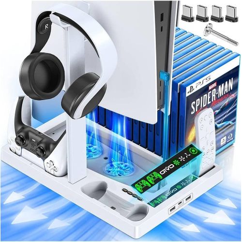The ps5 stand with efficient cooling fans and ps5 controller charger station,headset holder,15 ps5 game storage , three extra USB charging ports, screw storage.This ps5 cooling station can quickly charge two ps5 at the same time, and dissipate heat for ps5 console playstation 5.