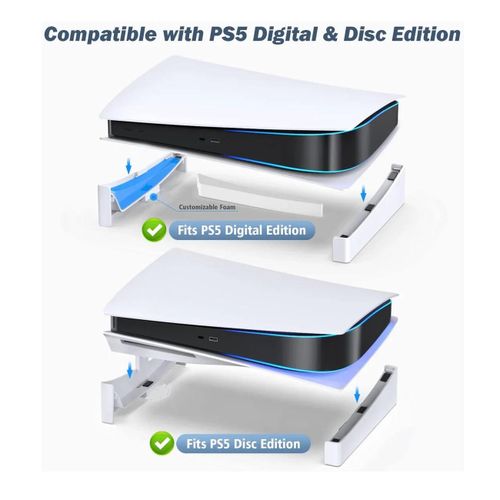 Perfect for PS5 Digital & Disc versions. The horizontal stand is compatible with PlayStation 5 disc (PS5 UHD version.) and for PS5 Digital edition. The stand allows you to place the PS5 console in a horizontal position to save space, which is more stable than a vertical stand.