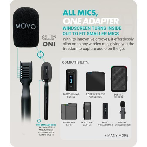 UNIVERSAL COMPATIBILITY: The mount of the handle features multiple grooves to lock in the clip of the Movo WMX-2 and Movo Wireless-Mini. Also compatible with the DJI Mic, Rode Wireless GO Series, Hollyland Lark Series, and other wireless microphones