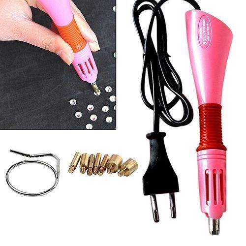 Create beautiful designs on a variety of accessories with this Rhinestone Setter Hot Fix Applicator. It is a tool that allows the user to affix rhinestones to most surfaces with ease. This fix applicator rhinestone setter tool includes one wand with an on / off switch, a stand for cooling and seven tips, four of which are for crystals and three for studs.Tool features an on/off switch Ideal for applying rhinestones to most surfacesIncludes seven tips in total, three stud and four crystalThis rhinestone applicator comes with one support stand for cooling On/off switch with light indicator Warms in just 2minsSoft hand grip Applicator stand for cooling