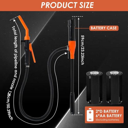Battery Powered: The liquid transfer pump is battery powered that is convenient to use. Suitable for outdoor events or emergencies. It is ideal for use in the event of a electric cut. The liquid transfer pump requires 2 x D batteries or 6 x AA batteries (Batteries not included)