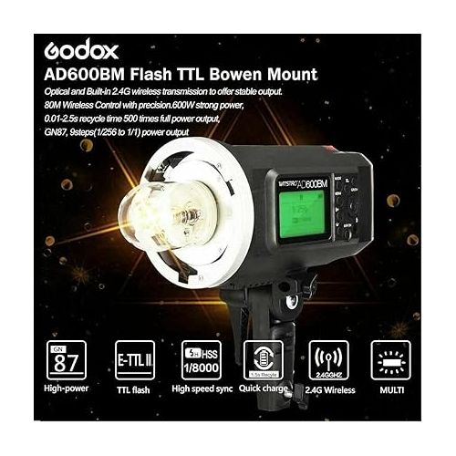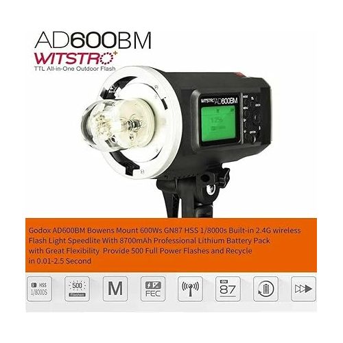 Godox AD600BM Bowens Mount 600Ws GN87 HSS Outdoor Flash Strobe LightAD600M/AD600BM All-in-One Outdoor Flash is powerful and portable with professional lithium battery pack. Built-in Godox 2.4G wireless X system, AD600M/AD600BM support M/Multi functions. Both AD600M (Godox mount) and AD600BM (Bowens mount) have varies of accessories. With the AD600 series flash,your shooting will become simpler. You can easily achieve a correct flash exposure even in complex light-changing environments.