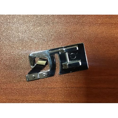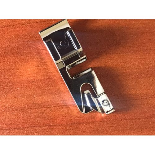 The rolled hem presser foot is fitted with groove and turning pin to align the hem of the fabric while sewing.