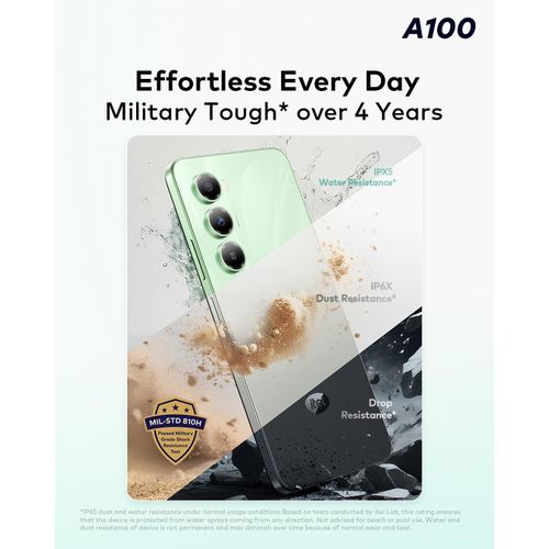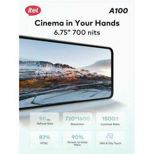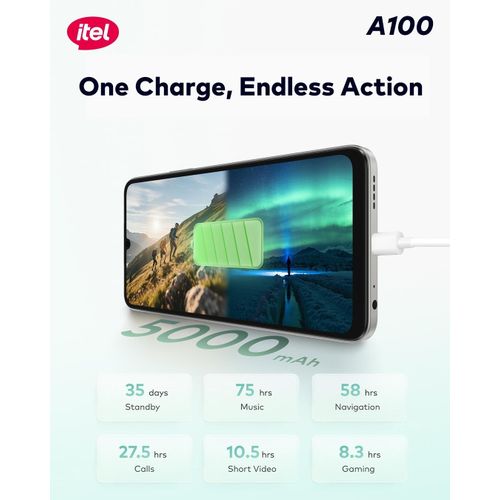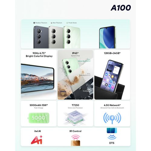 The itel A100 is a budget-friendly smartphone that’s designed to go the distance—literally. It’s powered by a strong T7250 octa-core processor, loaded with 128GB of storage, and backed by a long-lasting 5000mAh battery with 15W fast charging. With its 6.75" bright 90Hz display, it offers smooth visuals even under direct sunlight, and IP65-rated durability keeps it safe from water, dust, and drops.