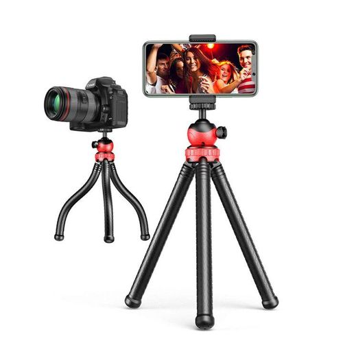 -With this octopus tripod for mobile and camera, you get all the conditions to find the right angle when you take photos or film. The tripod has three bendable legs and a ball-shaped camera mount that can be rotated 90°. The feet are made of a silicone material to prevent the tripod from slipping, and since the legs are water resistant, the stand can be used both indoors and outdoors. The bendable material allows you to attach the tripod to everything from the bicycle handlebar to a pole or tree branch. -A mobile mount in adjustable size is included, so you can record professional material even with your mobile phone.