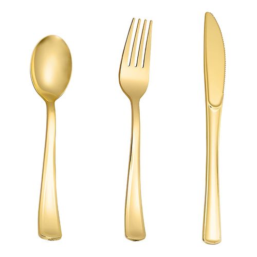 Our set of 60 gold, plastic, and silverware adds a touch of sophistication to any event. Each piece has a smooth surface that shines like real gold.