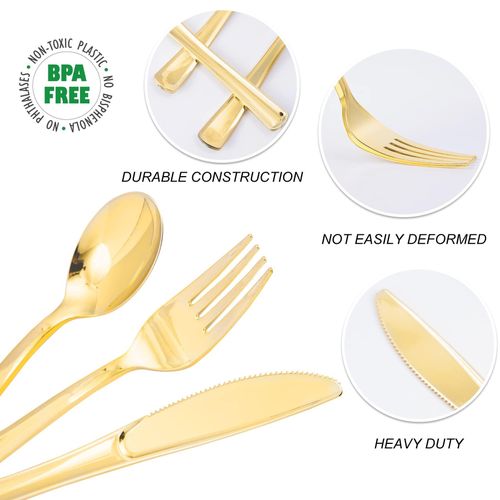 【Safe Material】Your health and safety are our top priority. This gold silverware disposable set is food grade, ensuring that you can use it with confidence, realizing it is devoid of any detrimental materials.