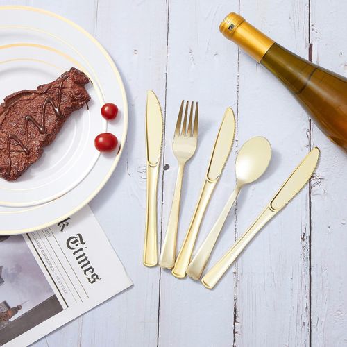 【Versatile for Various Occasions】Whether you're hosting a wedding, birthday, or any other party, this gold utensils set disposable is the perfect addition to your table setting. It's not only practical but also adds a touch of elegance to any event.