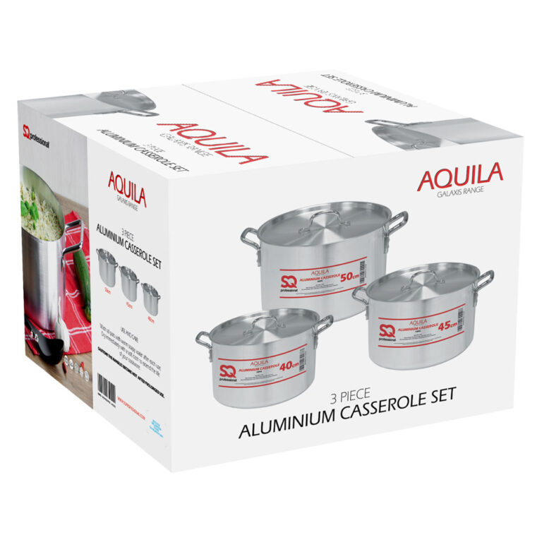 The Aquila Casserole Set is a must-have for all large and commercial kitchens! The Aquila casserole set is designed to withstand daily use for large quantities of cooking. Forged from high-quality aluminium, the set is lightweight considering its size, making it easy to move around the kitchen. The material and design of these timeless pots allow for supreme heat conductivity and distribution. The pots will heat up quickly and evenly, allowing for exceptional cooking results day in, and day out. The riveted handles offer extra stability and strength to hold the weight of the cooking inside. With 3 sizes, there will surely be something to suit various everyday needs in large and busy kitchens.
