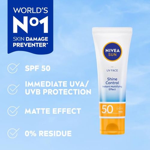 NIVEA SUN UV Face Shine Control SPF 50 is especially developed for delicate facial skin. Formula with Ultra Spectrum Protection provides immediate protection against UVA & UVB induced skin damage as well as from High Energy Visible Lights effects such as premature skin aging.
