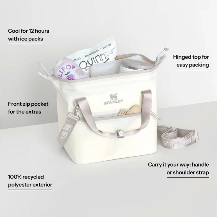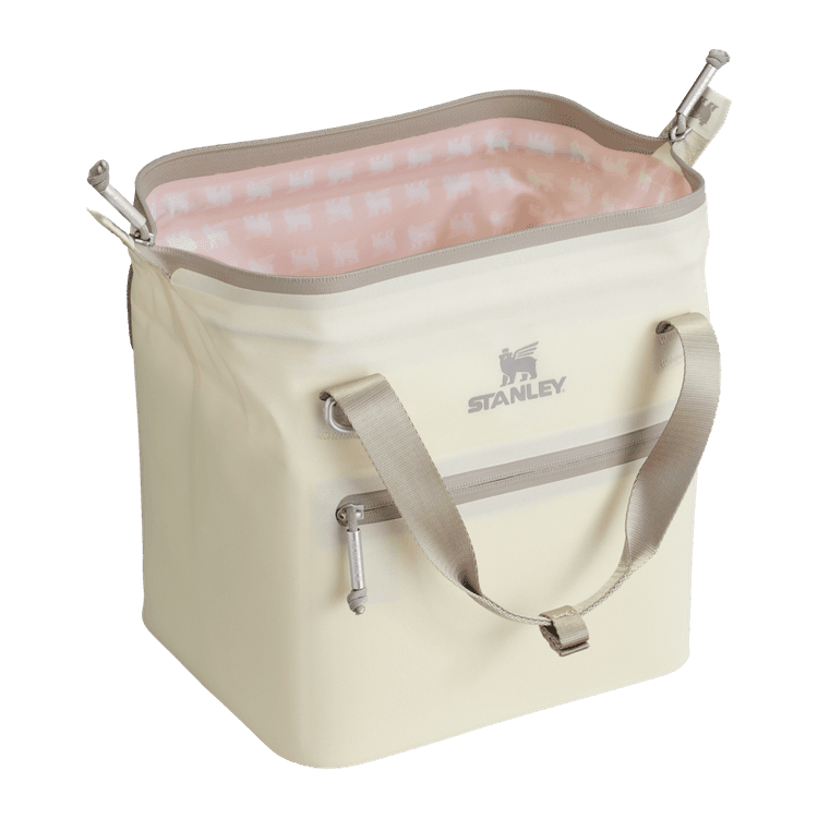 These vibrant coolers with contrast details, and a patterned winged bear liner, hold all you need for picnic dates, city hikes, and weeknights with friends. Head outside to soak up the fun and recharge. With a 10-can storage capacity, the All Day Julienne Mini Cooler keeps your goods nice and cool for 12 hours. The unique “doctor’s bag” hinge top pops open to help with unpacking. Load up with reusable ice packs, pop it shut and the sturdy zipper keeps things safely stored. The snap-top handles have a comfortable grip, while a zippered pocket protects your valuables. There’s also the option to attach the strap to sling the cooler over your shoulder. From acai bowls to charcuterie, sparkling beverages and wine are ready to be enjoyed. Don’t forget to pack all your favorite snacks and drinks in Stanley style.