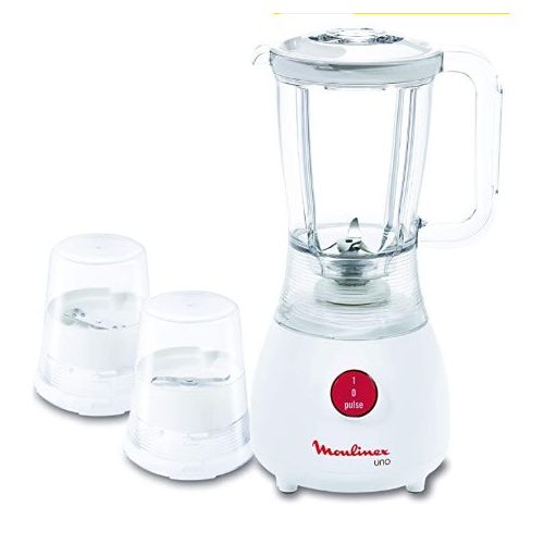 - A powerful 350 watts compact blenderThe Moulinex LM2221BA Blender is constructed using premium quality plastic that makes it robust. This device has a push button pulse control that makes it easy for you to operate it whether you are left or right handed. The glass blender has a capacity of 1.25L, which is ideal for blending health drinks, savory dips, spicy curries, and more. It is compact and weighs only 1.35kg that makes it easy to move around the kitchen whenever you need to.