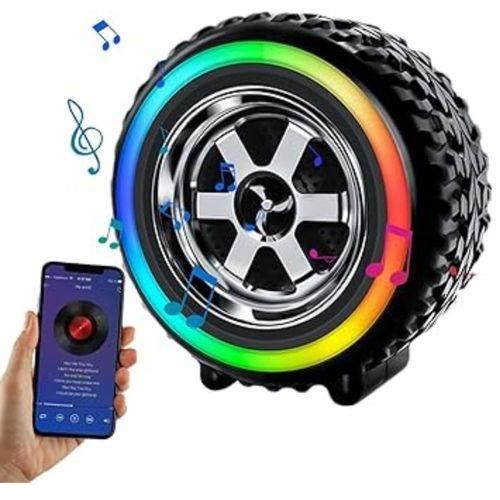 - Design: It features a unique tire-shaped design with a speaker in the center and often includes LED lights around the rim that can create a colorful visual effect.