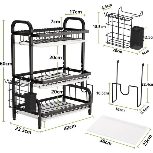 The Cyfaza 3-tier dish drying rack offers significantly more storage than traditional 1 or 2-tier racks. It includes 1 dish rack, 1 utensil holder, 1 cutting tool and cutlery holder, 1 cutting board holder, and 3 removable drain trays. The top tier can hold approximately 17 plates, while the middle and bottom tiers are perfect for bowls, cups, pots, pans, bottles, and more. Side attachments help efficiently dry all your silverware and cutting boards.
