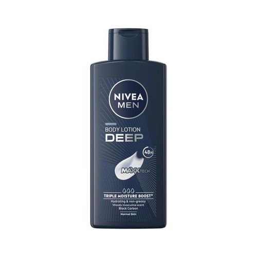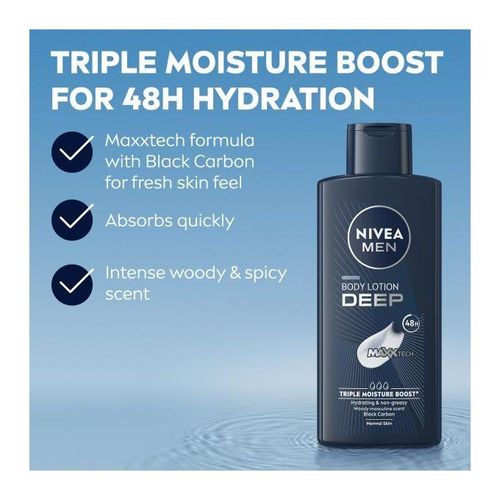 NIVEA MEN Deep Body Lotion hydrates your skin with triple moisture boost. It is non-greasy, with an intense woody masculine scent and enriched with Black Carbon formula giving you a fresh and clean feel It leaves your skin feeling hydrated and healthy.