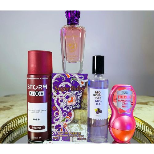 0 reviews for Fragrance World Sugar Baby EDP Perfumed Natural Spray 50ml & Storm Elixir Inferno Body Spray 200ml & Monogotas Mora 100ml & Tag Ultra Dry Roll On